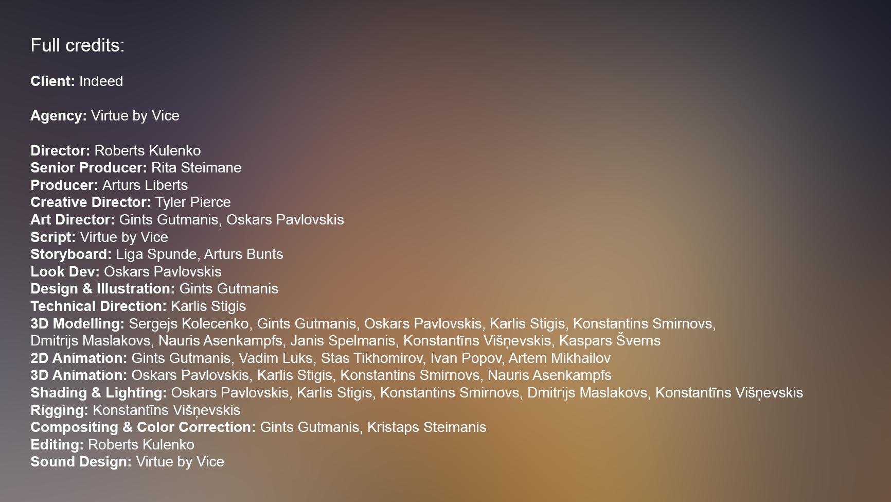 I was responsible for creating 3D characters for use in Indeed Commercial. I have worked based on provided 2D sketches. Consulting with Art Director and Concept Artist along the way.